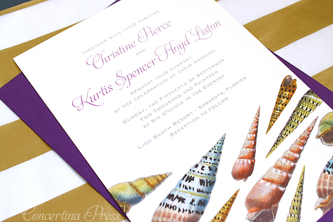 Shortly after moving to Florida, I had a special request from a bride getting married in Sarasota for a purple seashell themed wedding invite - my spiral seashell wedding invitation was the perfect fit, especially paired with purple envelopes and purple font for the names.